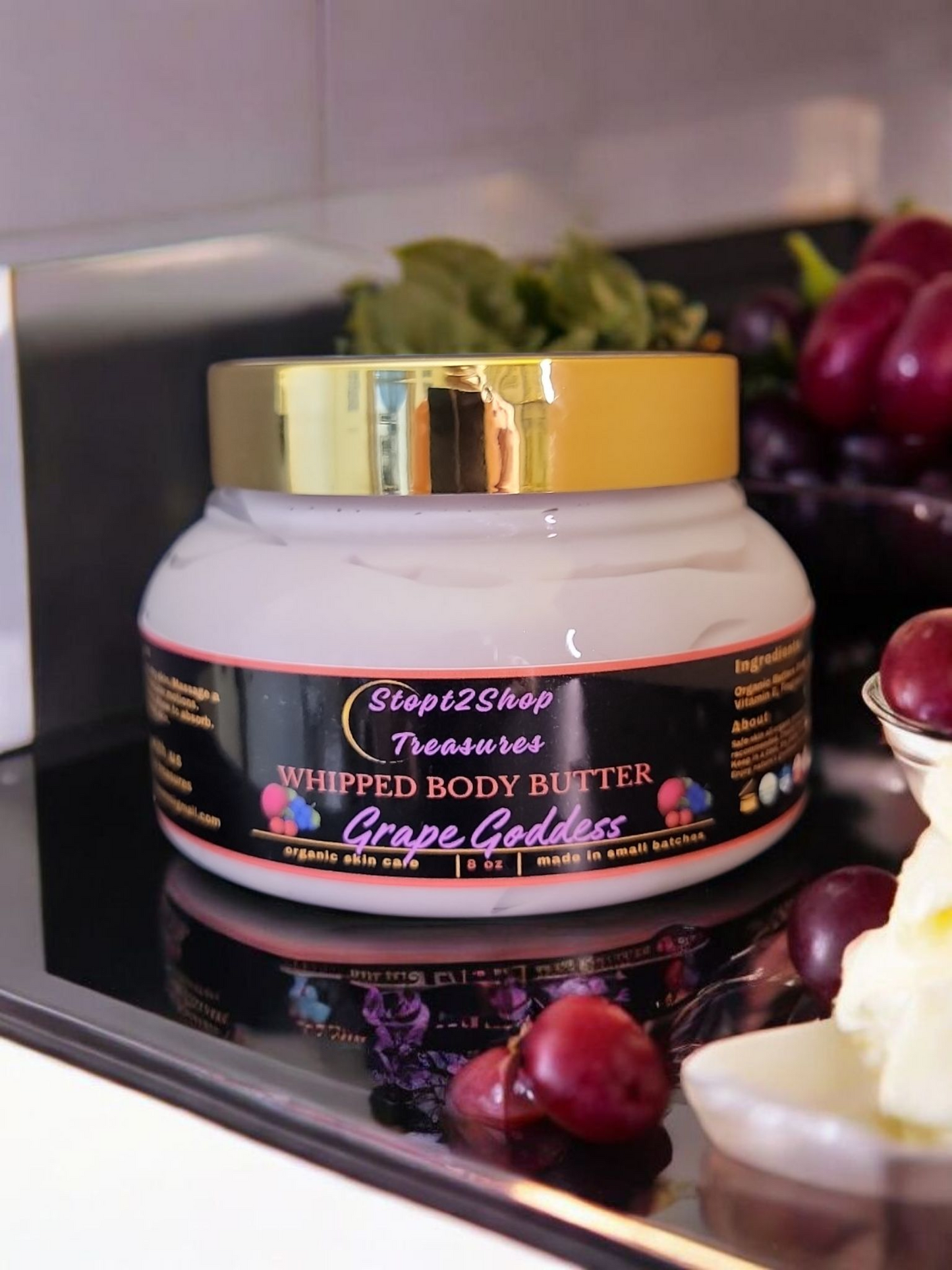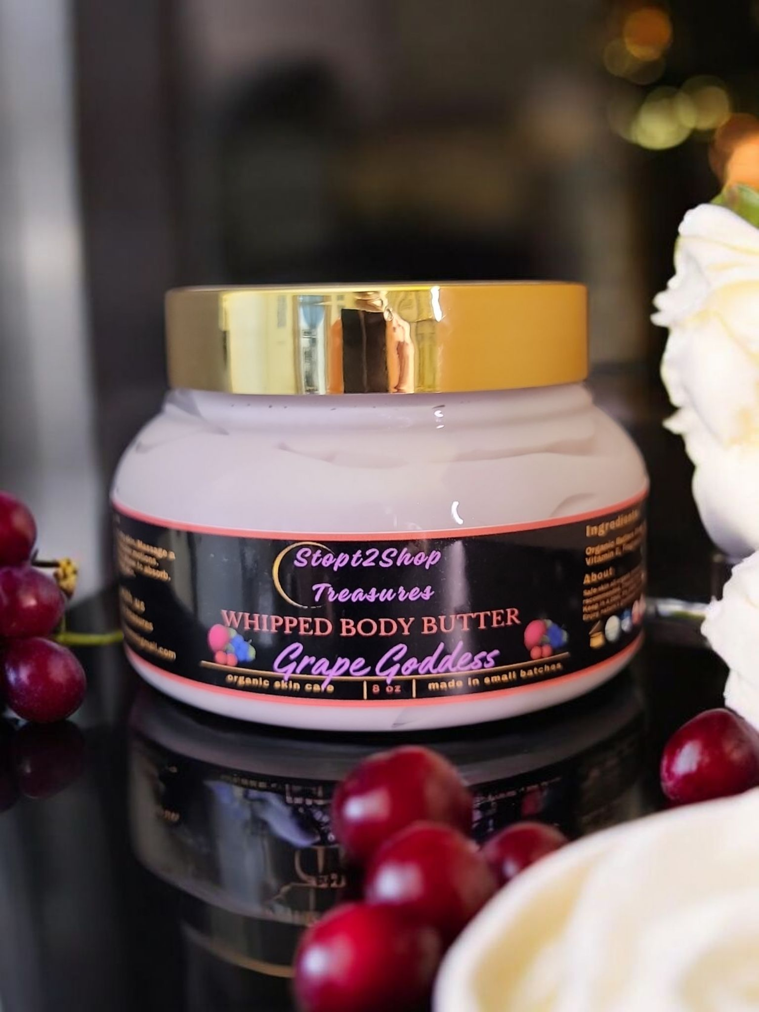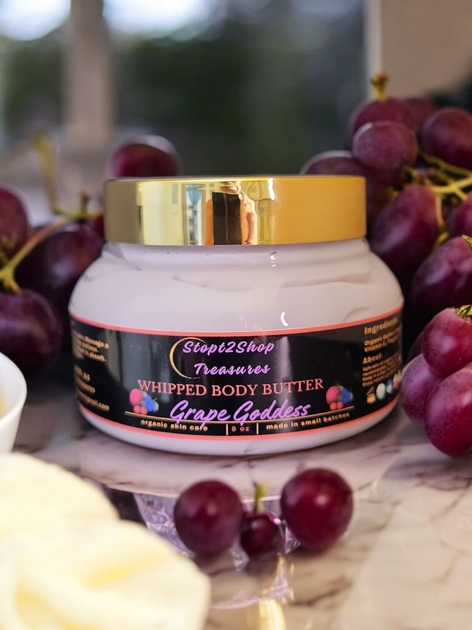 Step into your divine energy with Grape Goddessβa luxurious whipped body butter that melts into your skin like silk. Infused with the luscious scent of juicy grapes, cherry blossom, and tropical papaya passionfruit, this butter is a celebration of softness, femininity, and bold beauty. Rich in moisture and made with our signature blend of three nourishing butters, it leaves your skin glowing, supple, and kissed with a sweet fruity trail.